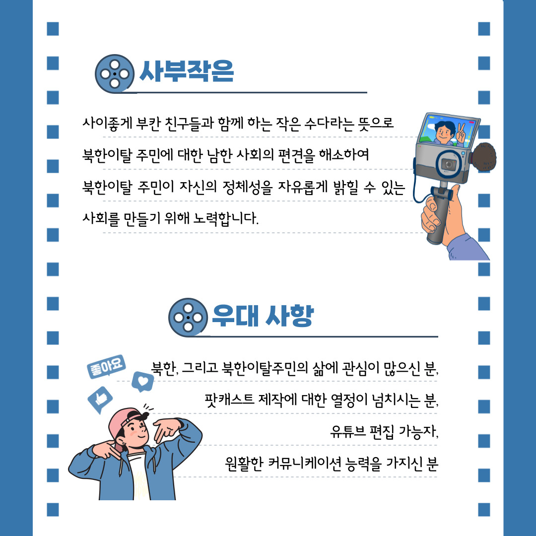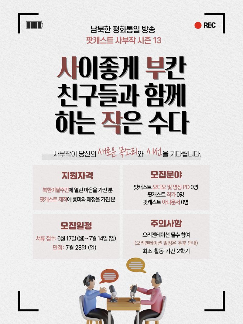 - 그간 사부작은 남북한 출신 MC가 함께 방송을 진행해 왔습니다. 최근 북한 출신 MC들의 활동 기간이 끝나 새로운 북한 출신 MC의 지원이 필요합니다. 북한이 고향인 분들의 많은 지원 부탁드립니다. 물론 남한 출신 지원자들도 환영합니다 :)