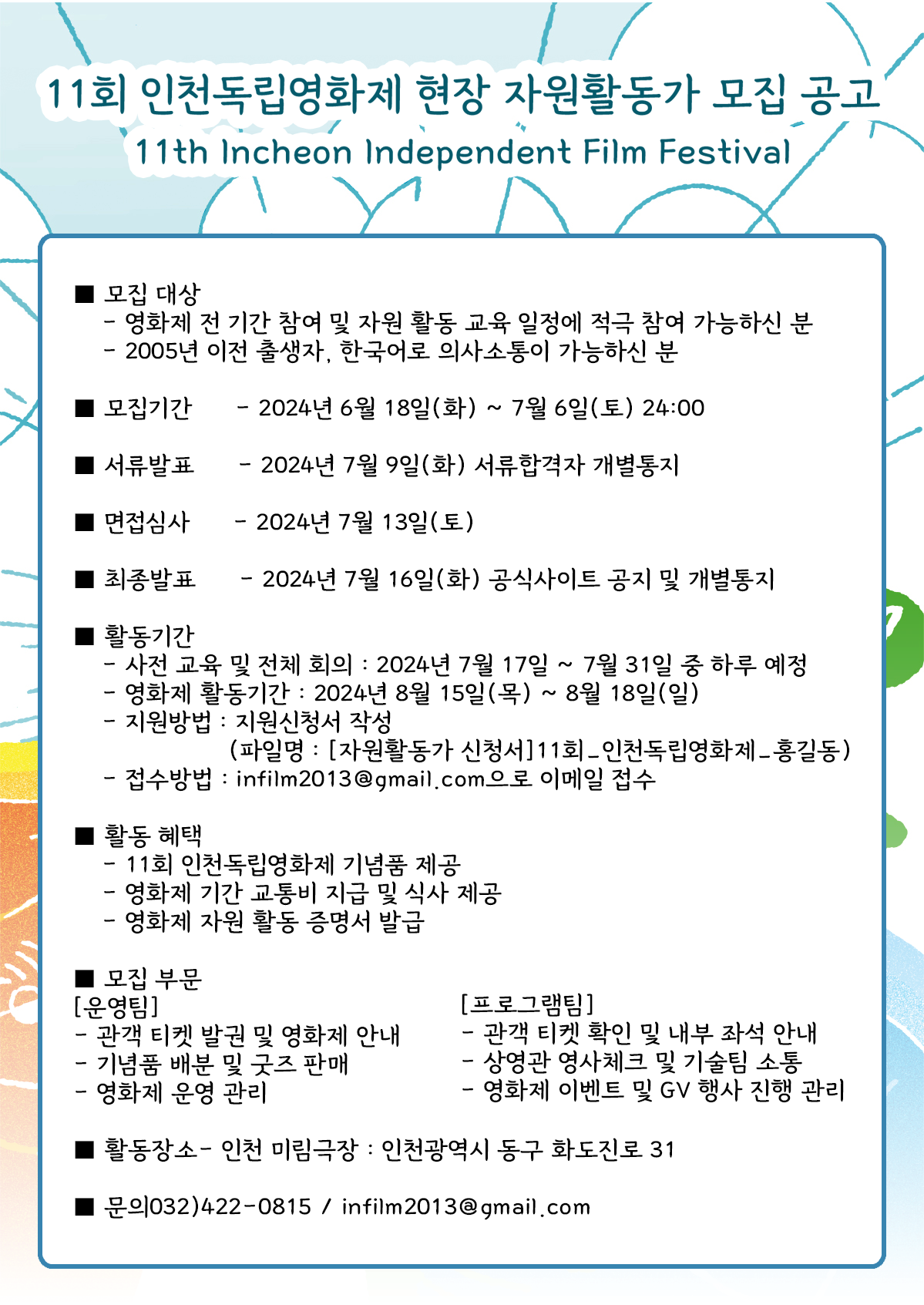 2024년 8월 15일부터 8월 18일까지 인천 미림극장에서 열리는 11회 인천독립영화제를 함께 만들어 갈 ‘INFF 2024’ 현장 자원활동가를 모집합니다.