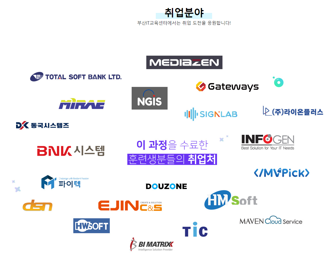 지원해드리는 취업처들! 수료 후 6개월까지 취업지원을 받을 수 있습니다.