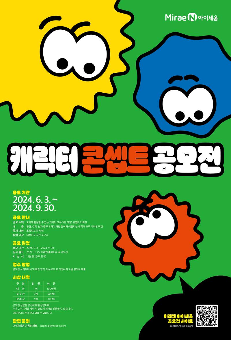 세상을 살아가는 힘이 되어 줄 다양한 지식과 책 읽는 즐거움을 선사해 온 미래엔 아이세움에서 2024 캐릭터 콘셉트 공모전을 개최합니다. 참신한 아이디어와 남다른 표현력을 갖춘 창작자분들의 많은 관심과 응모 부탁드립니다.