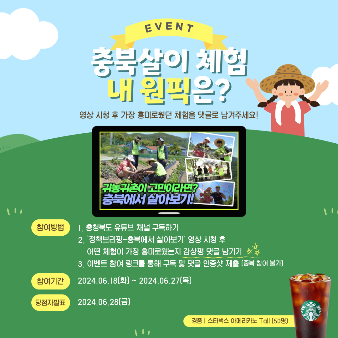 지금 충청북도 유튜브 채널 구독 후 <충북에서 살아보기 편>에 댓글을 작성하고 인증해 주세요!