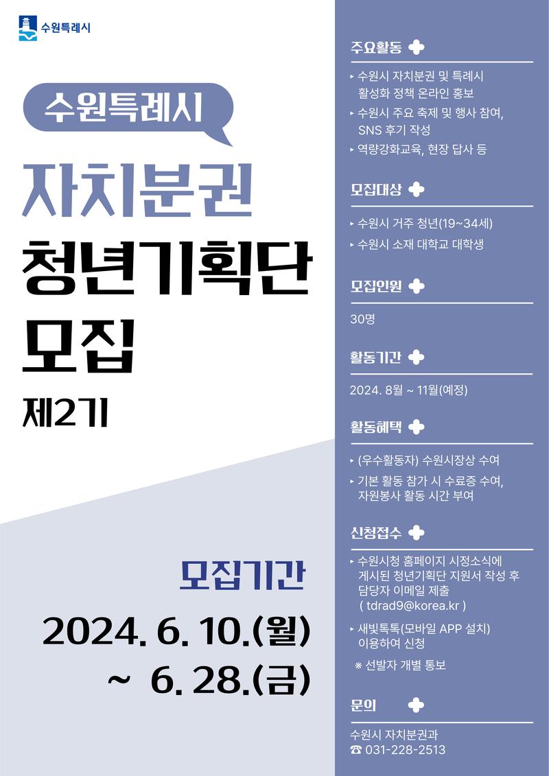 자치분권 관련 각종 행사에 적극 참여·지원하고 SNS 등을 활용해 수원특례시 자치분권에 대한 다양한 소식을 적극 홍보할 ‘수원특례시 자치분권 청년기획단 제2기’를 모집하고자 하오니,