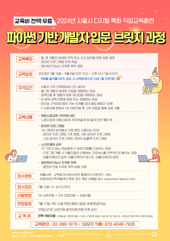 - 비전공 구직여성 참여 가능 (6개월 이내 졸업 예정자 포함)