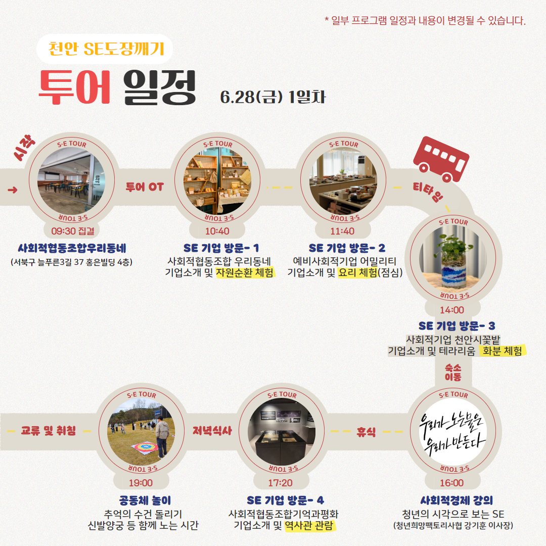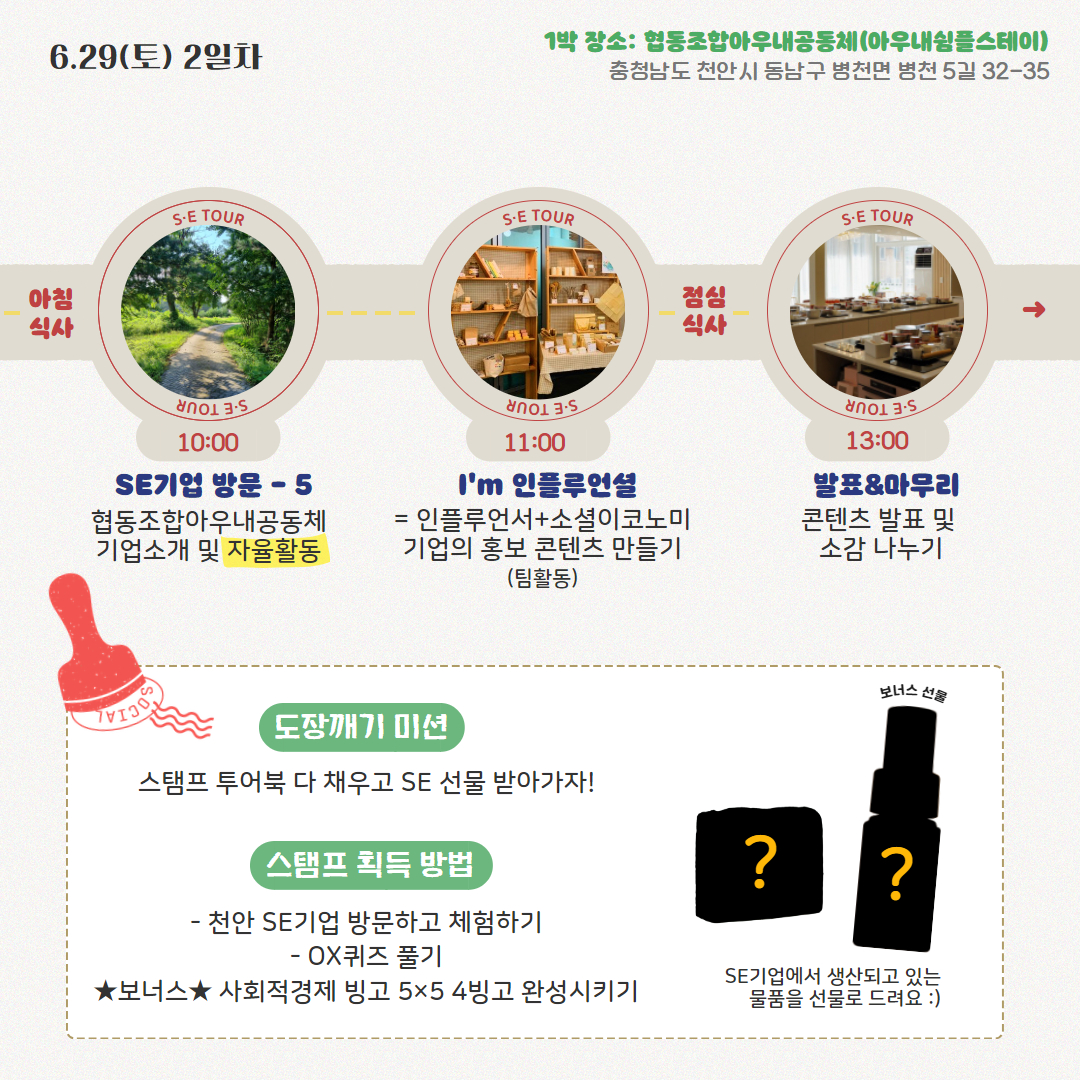 1박 2일동안 천안시 내 사회적경제기업을 하나씩 도장깨기할 청년 참여자를 모집합니다! 사회적경제에 대해 알아가고 같은 청년들과 함께 친해지는 시간을 경험하고 싶다면?!