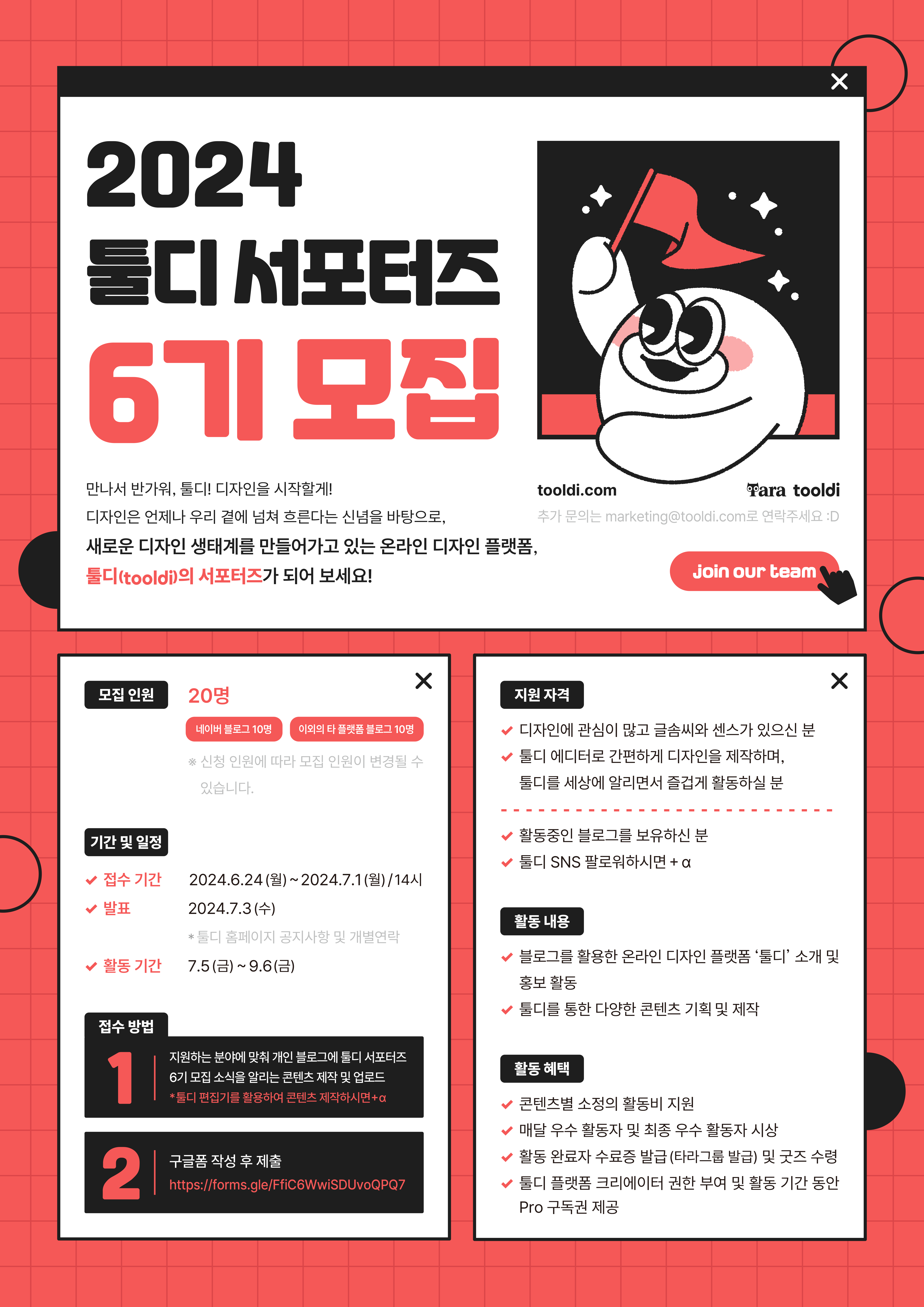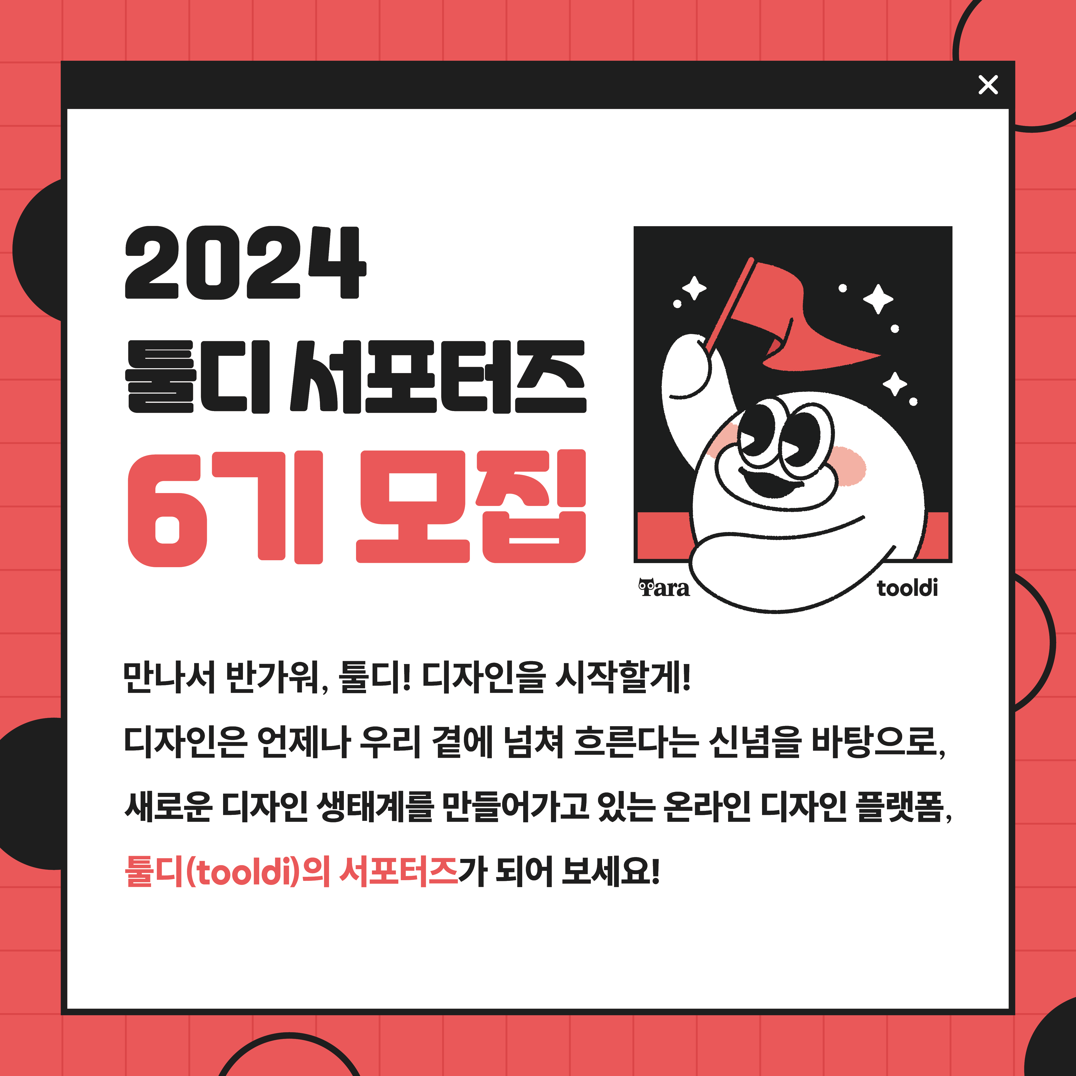 새로운 디자인 생태계를 꾸려 나가는 툴디(tooldi)의 여섯 번째 서포터즈를 모집합니다!