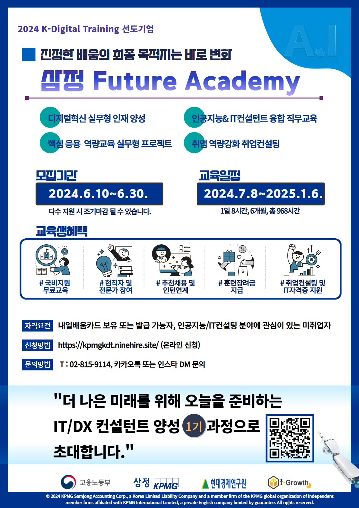 이러한 수요에 대응하기 위해 삼정KPMG는 KPMG Lighthouse와 MS-Enterprise AI서비스팀을 운영한 역량과 전문성을 바탕으로 IT/DT/DX 컨설턴트를 양성하여 전 산업의 디지털 전환을 이뤄 가고자 합니다.