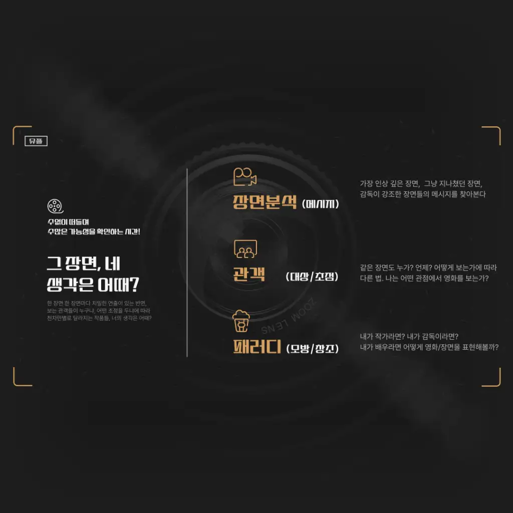 영화 산업에 관한 이야기보단 "영화 그 자체에 대한 이야기"를 자유롭게 나누는 동아리입니다!