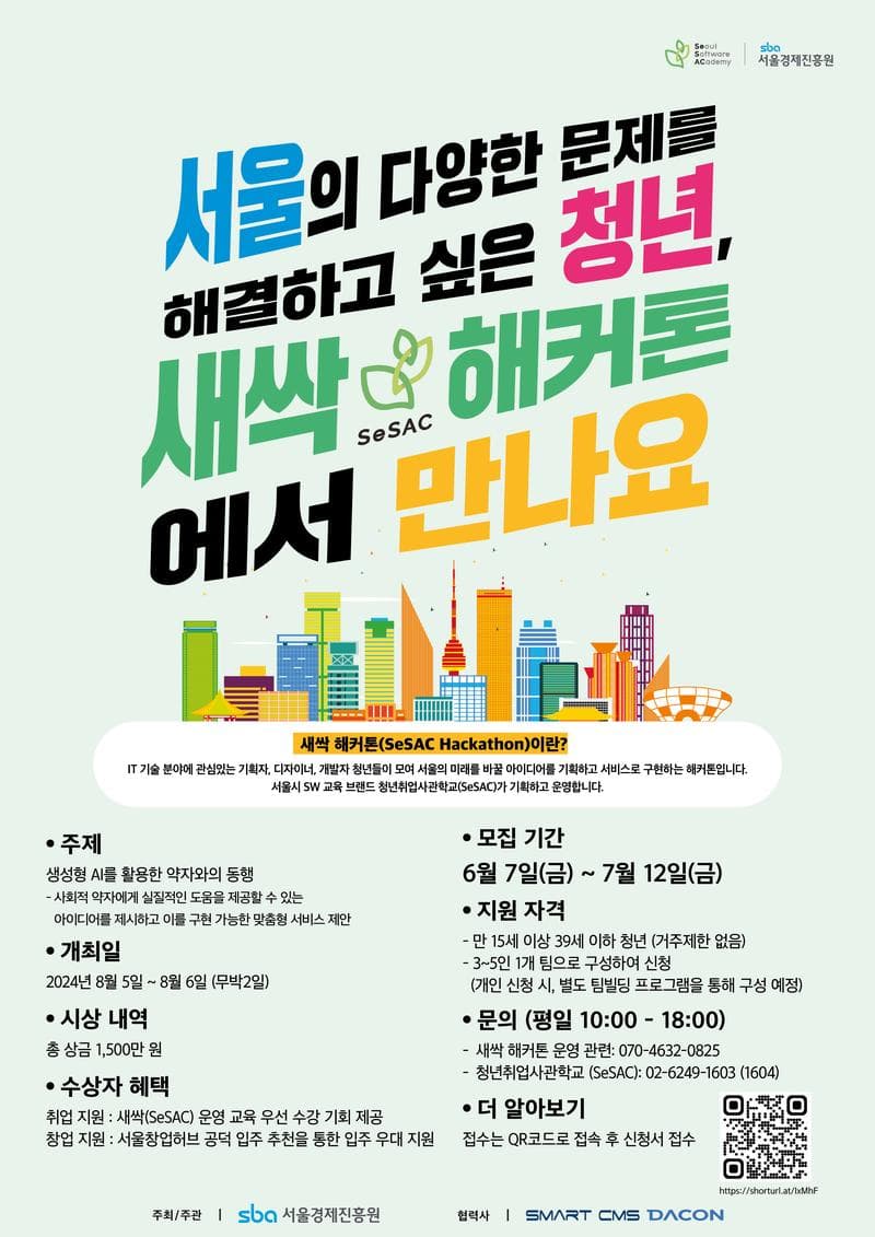 A. IT 기술 분야에 관심있는 기획자, 디자이너, 개발자 청년들이 모여 서울의 미래를 바꿀 아이디어를 기획하고 서비스로 구현하는 해커톤입니다. 서울시 SW교육 브랜드 청년취업사관학교(SeSAC)가 기획하고 운영합니다.