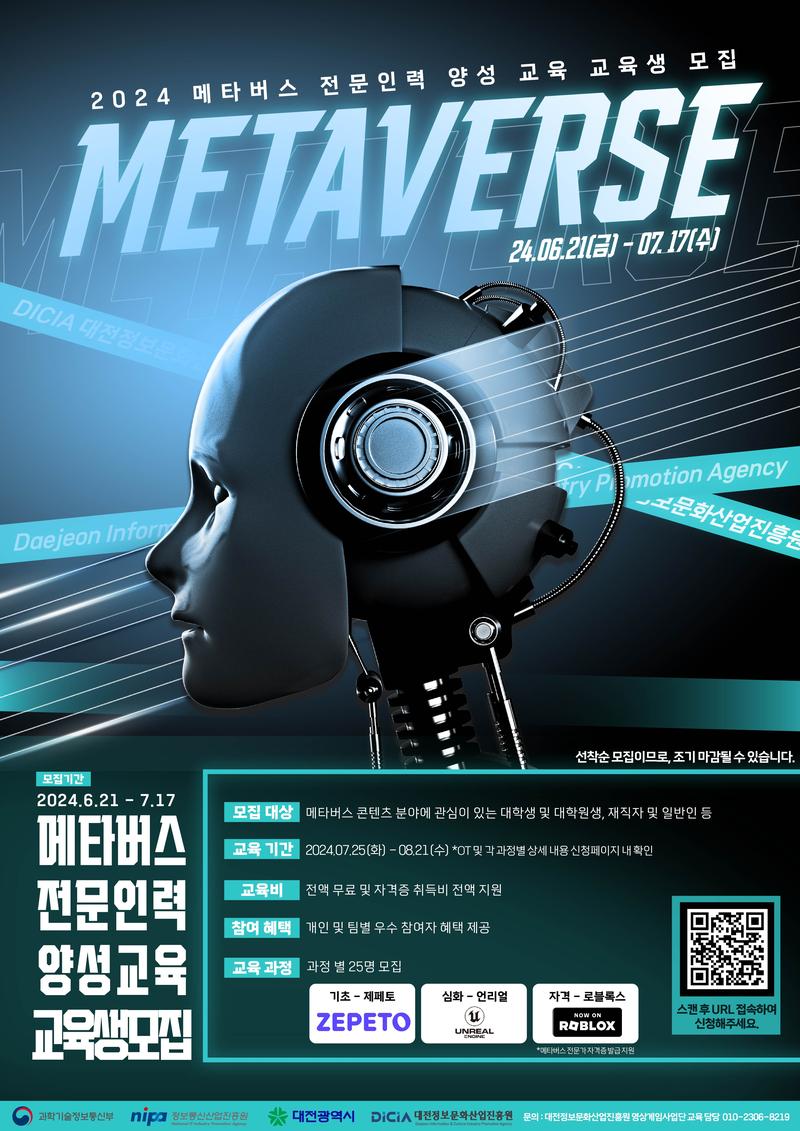대전정보문화산업진흥원(DICIA)은 메타버스 콘텐츠 분야에 관심이 있는 대학생, 대학원생, 재직자 및 일반인 등을 대상으로 메타버스 전문인력 양성 교육을 진행합니다.