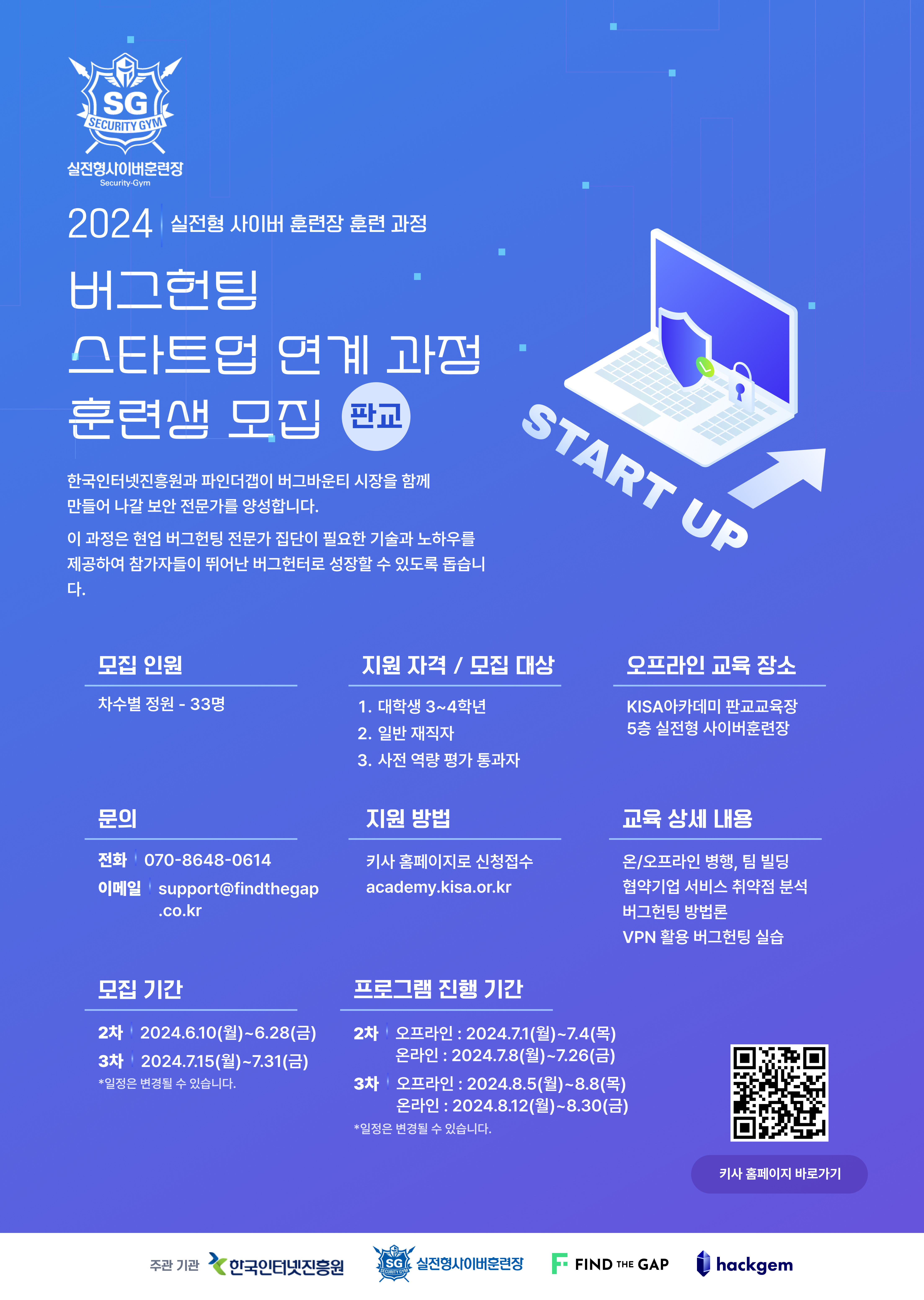 한국인터넷진흥원과 파인더갭이 버그바운티 제도의 성공적인 안착을 위해 버그헌터 양성을 지원합니다.