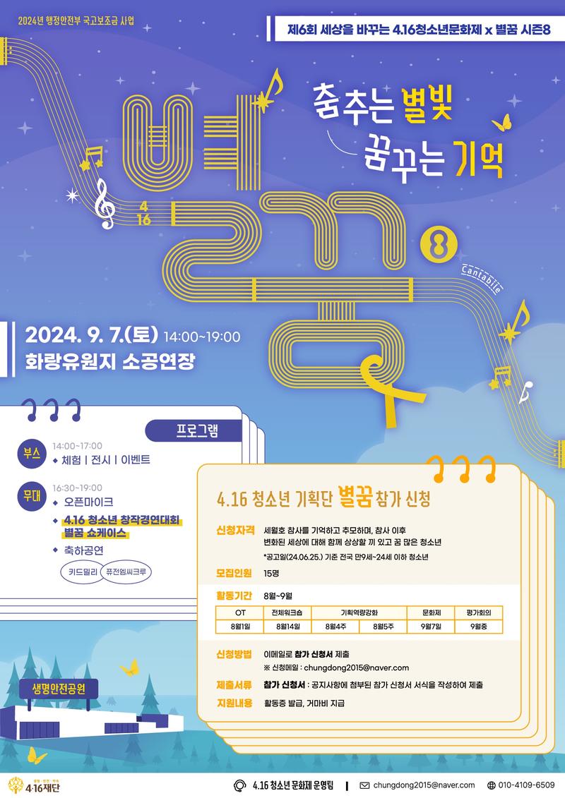 생명과 안전이 존중되는 사회를 만들어가는 4.16재단에서는 청소년들이 직접 참여하여 스스로 만드는 제6회 세상을 바꾸는 4.16 청소년문화제 x 별꿈 시즌8을 추진하기 위해 기획부터 홍보 및 운영을 함께할 청소년 기획단을 모집합니다. 끼 있고 꿈 많은 청소년 여러분들의 많은 관심과 참여 부탁드립니다.