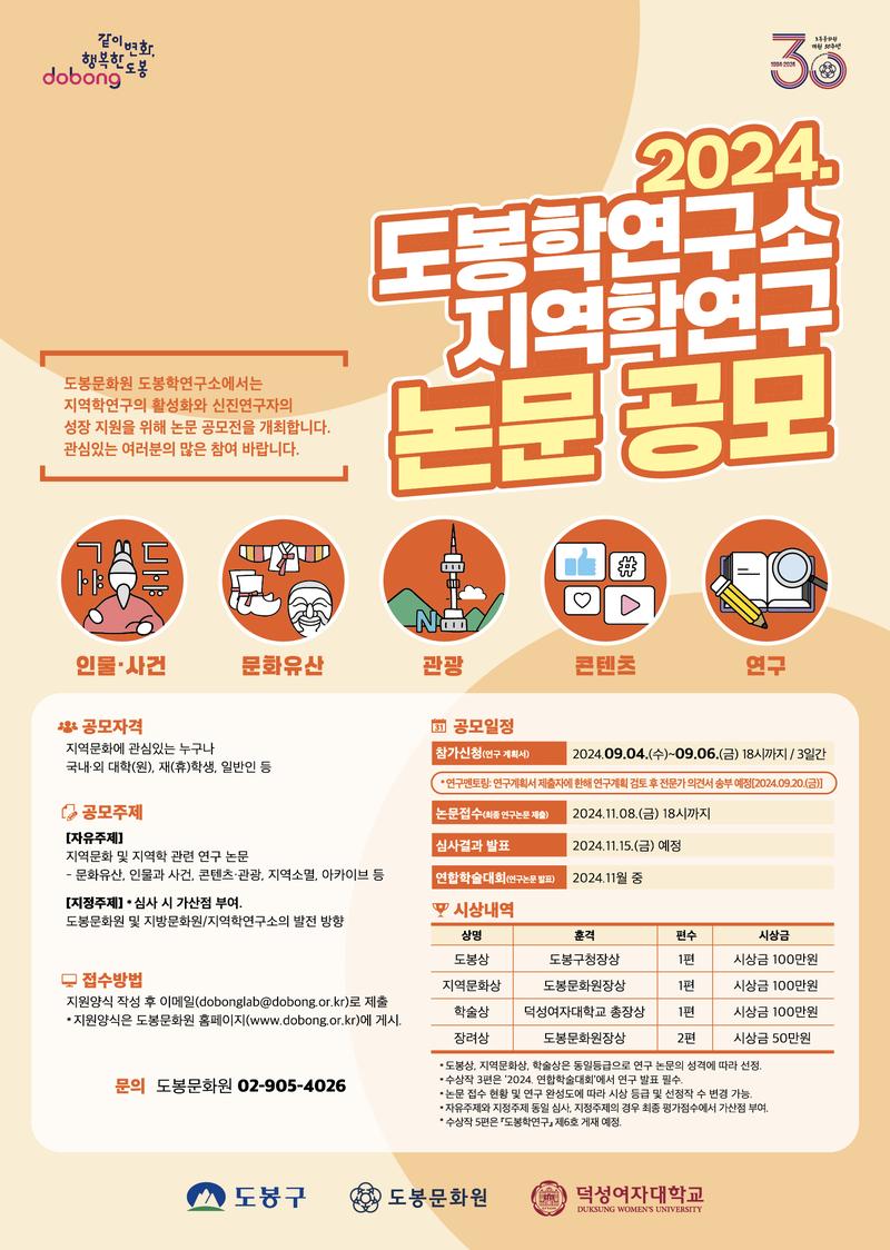 도봉문화원 도봉학연구소에서는 지역학연구의 활성화와 신진연구자의 성장 지원을 위해 논문 공모전을 개최합니다.