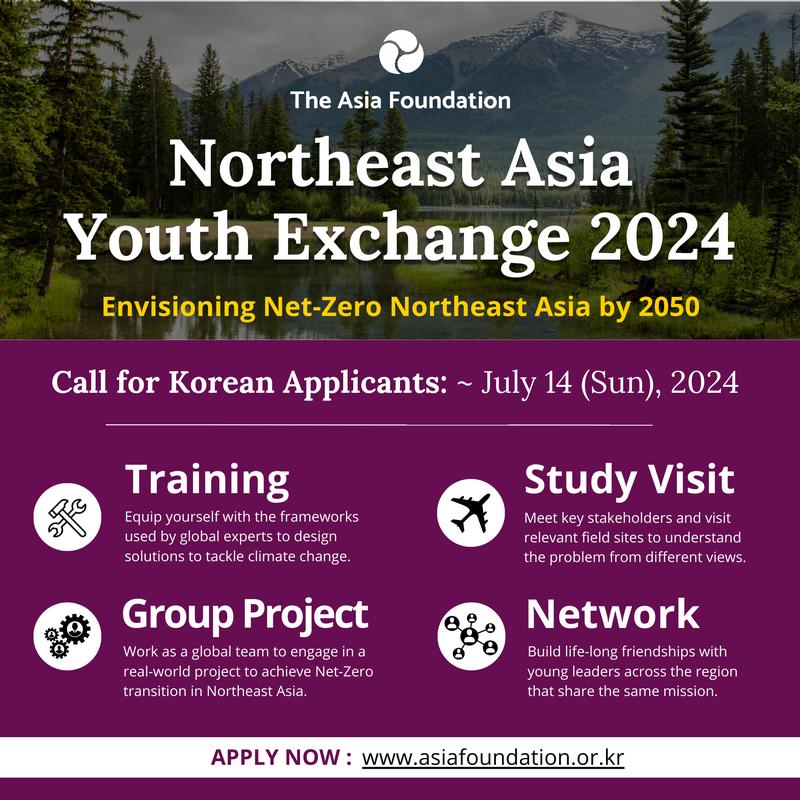 아시아재단은 “Envisioning Net-Zero Northeast Asia by 2050”을 주제로 실시되는 2024년 동북아시아 기후변화 청년 교류 프로그램에 참여할 국내 참가자 3명을 모집합니다.