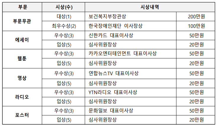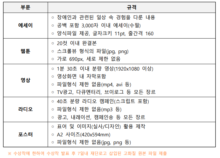 ● 공모주제 : 장애인 인식개선의 내용을 담은 순수 창작물 ※ 장애를 시련이나 극복할 문제, 시혜적으로 바라보는 콘텐츠 지양