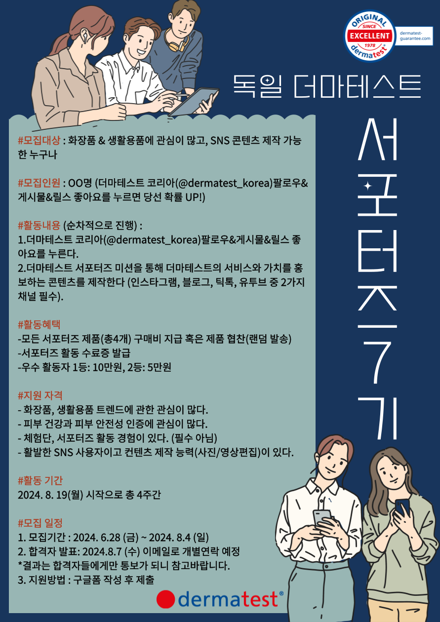 더마테스트는 K-뷰티가 안전하고 피부 친화적인 제품으로 더 잘 알려지고 새로운 미의 기준을 세우는데 기여하고자 합니다. 더마테스트의 가치와 서비스를 널리 알리는 서포터즈가 되어주세요! 🙂