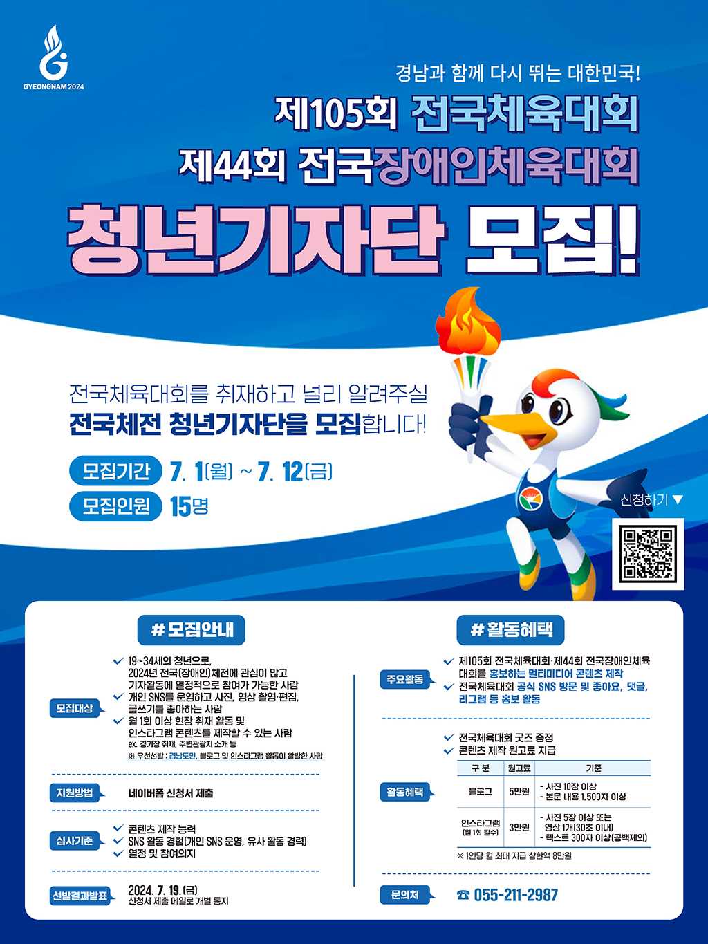 모집대상 : 19~34세의 청년으로, 2024년 전국(장애인)체전에 관심이 많고 기자활동에 열정적으로 참여가 가능한 사람/ 개인SNS를 운영하고 사진, 영상촬영·편집, 글쓰기를 좋아하는 사람/ 월 1회 이상 현장 취재 활동 및 인스타그램 콘텐츠를 제작할 수 있는 사람
