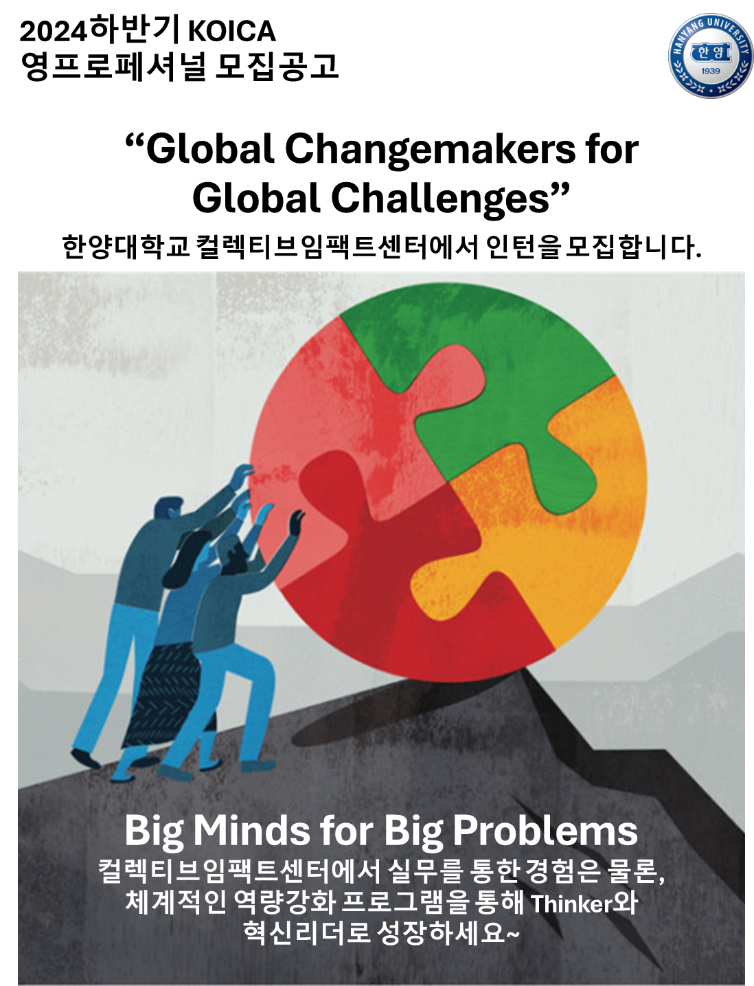 컬렉티브임팩트(Collective Impact)*의 확산과 실질적 사회문제 해결에 기여하고자 연구와, 교육, 컨설팅, 네트워킹 프로그램을 기획, 추진하고 있으며, 2024년부터는 SDG에 기반한 글로벌사회혁신 프로그램을 KOICA, 아쇼카(Ashoka), 루트임팩트 등 다양한 파트너들과 함께 준비하고 있습니다. 한양대의 건학이념인 사랑의 실천과 지속가능발전목표(SDGs) 실현에 기여하는 의미 있는 (국제)개발협력/사회혁신/ESG 프로젝트를 함께 기획하고 추진할 글로벌 체인지메이커들을 초대합니다.