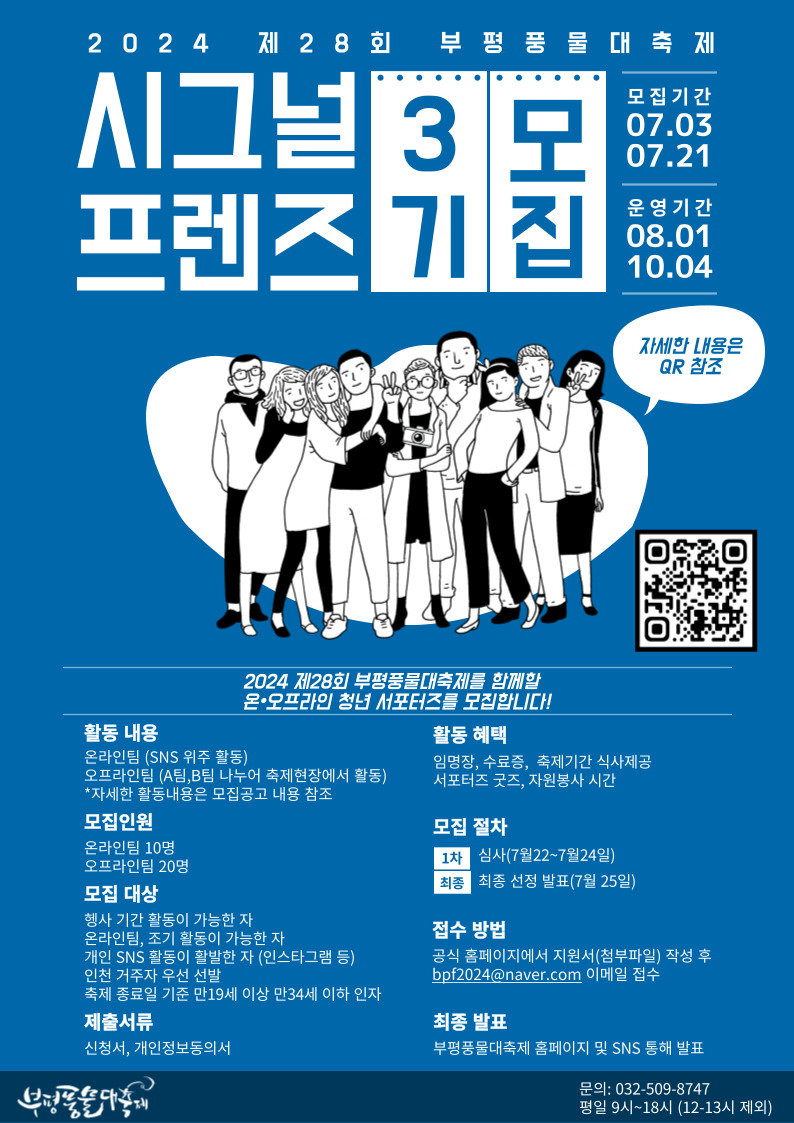 부평구 축제위원회에서는 2024년 9월 27일(금)부터 9월 29일(일)까지 3일간 부평역 일대에서『2024 부평풍물대축제』를 개최합니다. 부평풍물대축제는 1997년에 시작된 28년의 역사가 깊은 축제입니다. 올해 진행될 제28회 부평풍물대축제는‘K-풍물, 세대를 이어 세계로’라는 슬로건을 앞세워 법정 문화도시 부평의 다양한 문화를 알리며 또한 전통적 풍물을 잇는 역동적인 프로그램으로 준비하였습니다. 이에 잘 준비된『2024 부평풍물대축제』를 빛내기 위해 서포터즈를 모집합니다. 서포터즈‘시그널 프렌즈’는 ‘도로 위 신호등’을 뜻하며 부평대로 도로에서 안전하고 유익한 축제를 만들어 갈 『2024 부평풍물대축제』 서포터즈의 이름입니다. 시민과 함께 즐겁고 안전한 『2024 부평풍물대축제』의 신호등이 되어줄 ‘시그널 프렌즈’서포터즈 3기를 모집하고 있으니 많은 관심과 참여 부탁드립니다.