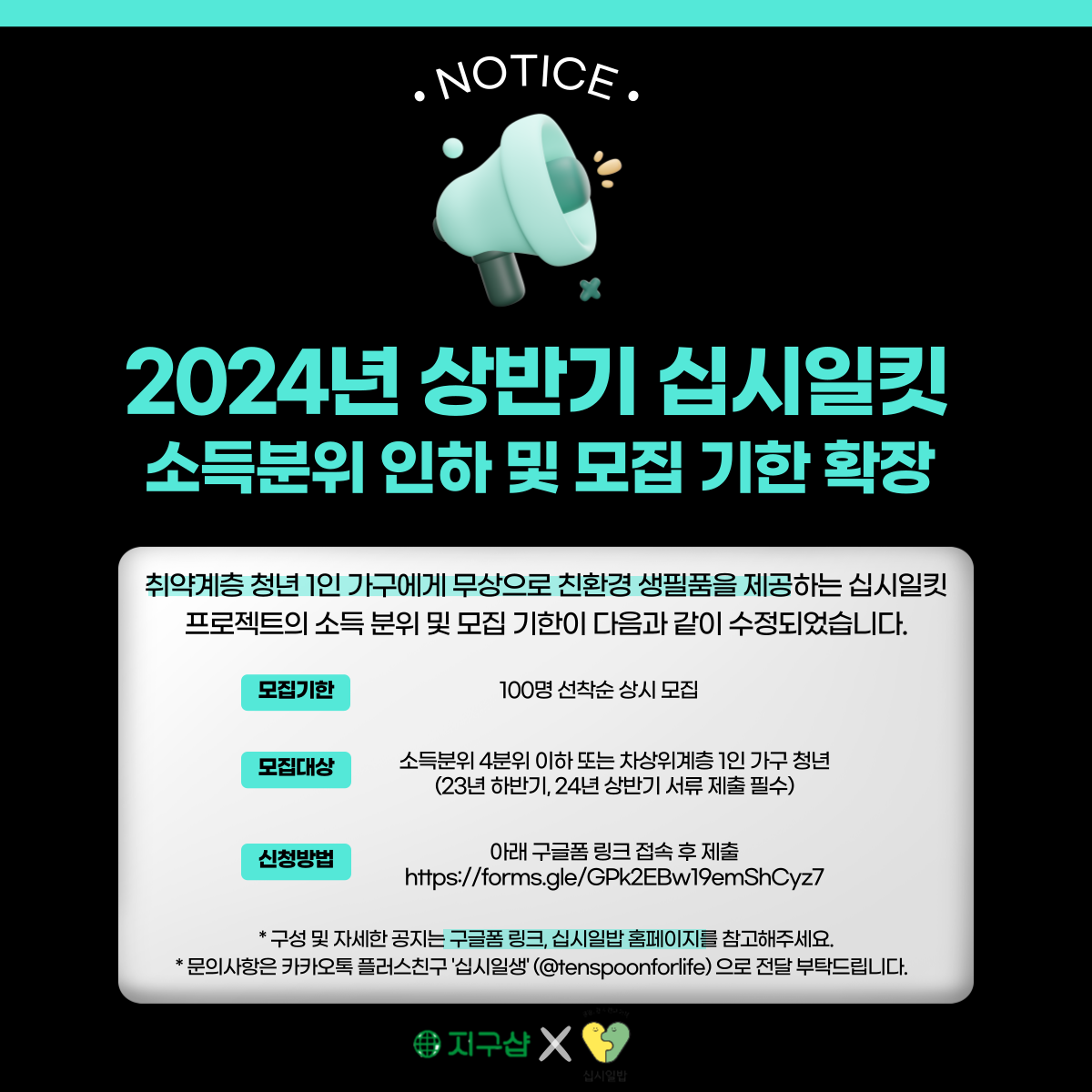 청년들의 생필품에 대한 비용 부담을 줄이기 위해 사회친환경 기업인 지구샵과 함께 생필품 키트를 배송하는 십시일밥 프로젝트인 십시일킷의 대상 인원 소득분위가 4분위 이하로 인하되었습니다!