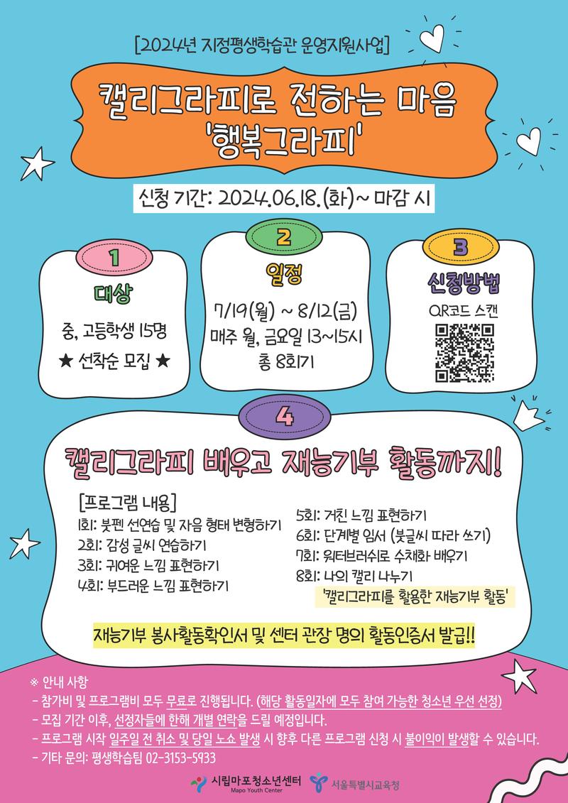 본 기관은 청소년들이 여름방학을 뜻깊게 보낼 수 있도록 예술 분야의 캘리그라피 교육을 제공하고 배움을 나누는 재능기부활동을 진행함으로써 청소년들이 자아 성취감을 함양하고 지역 사회에 기여하는 보람을 느낄 수 있는‘2024년 캘리그라피로 전하는 마음 [행복그라피]’ 진행합니다!