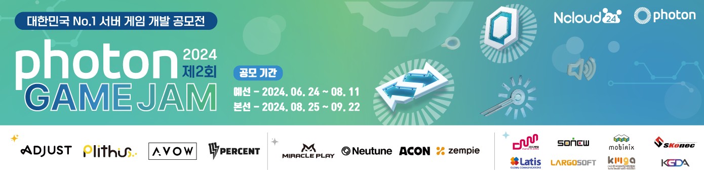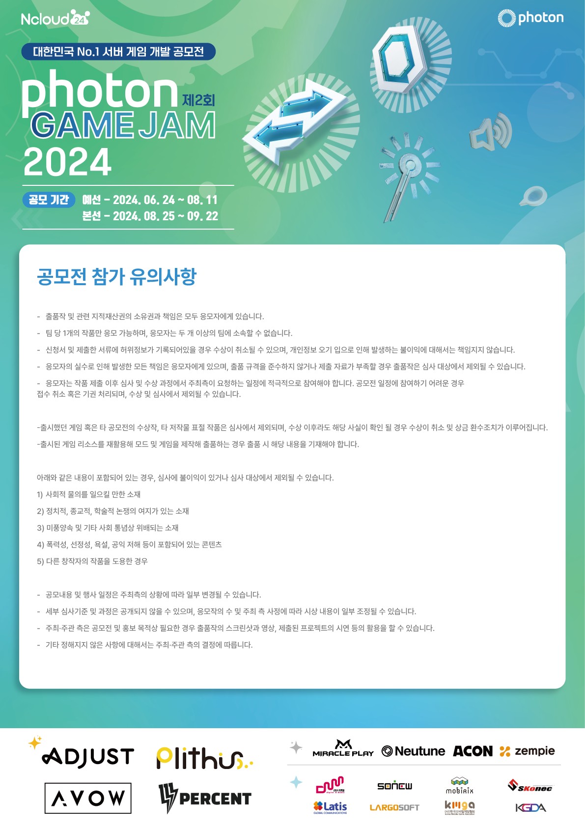 - '2024 Photon 게임잼' 제출작은 반드시 'Photon 제품군 (PUN, Fusion, Quantum 등)'을 사용해야 합니다.