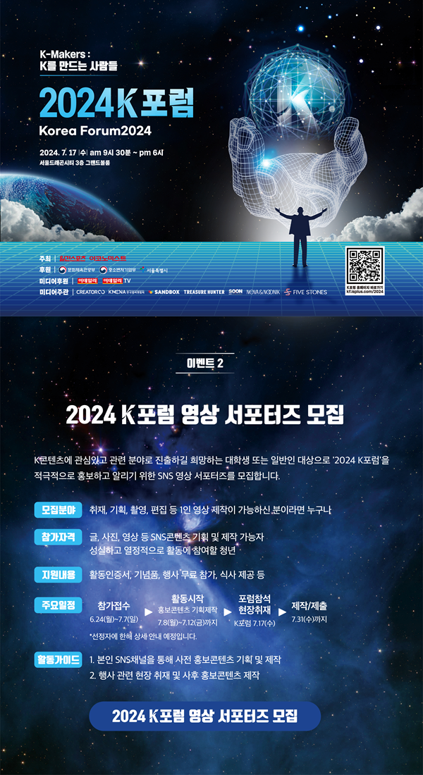 '2024 K포럼'을 적극적으로 홍보하고 알리기 위한 SNS 영상 서포터즈를 모집합니다.