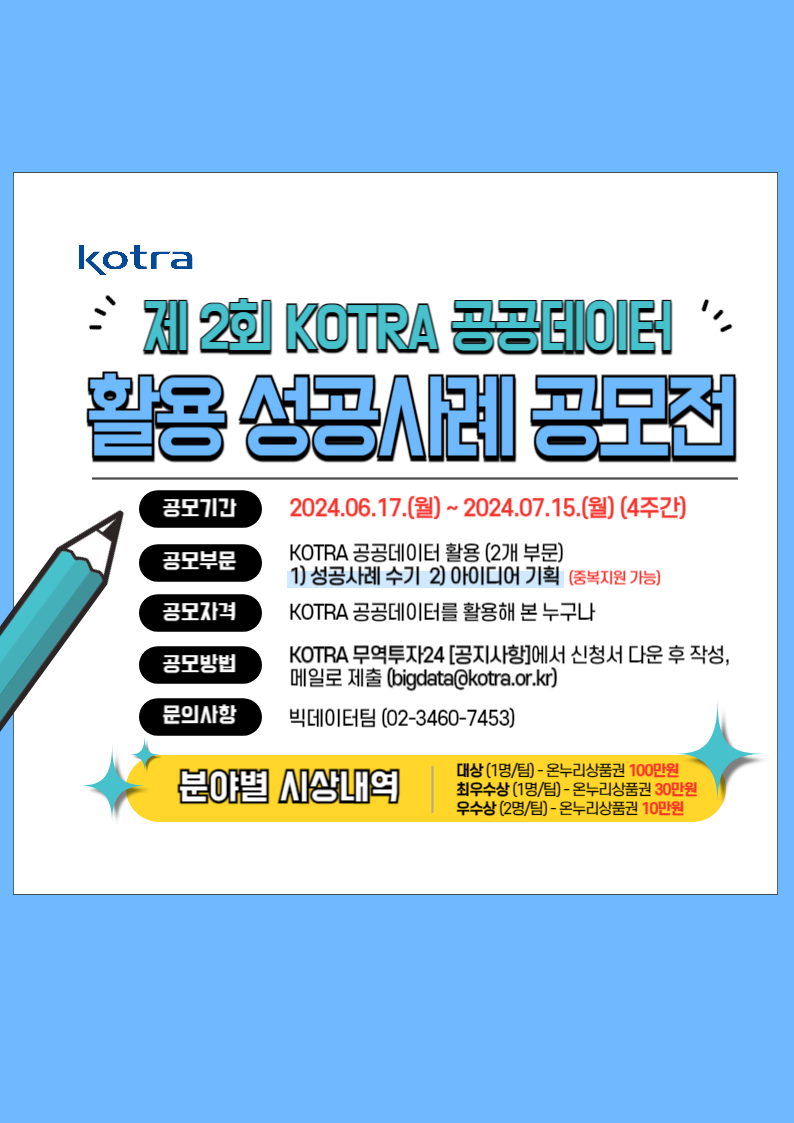 KOTRA 개방 공공데이터 활용 성공사례 분석을 통한 활용현황을 점검하고, 더 나아가 양질의 KOTRA 공공데이터 제공하고자 아래와 같이 ‘제2회 KOTRA 공공데이터 활용 성공사례 공모전’을 개최하오니 관심 있는 분들의 많은 참여 부탁드립니다.
