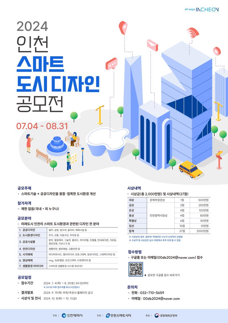 다양한 도시문제를 스마트기술과 공공디자인 관점으로 접근하여 해결방안을 모색하기 위한「2024 인천 스마트 도시 디자인 공모전」을 다음과 같이 공고하고자 합니다.