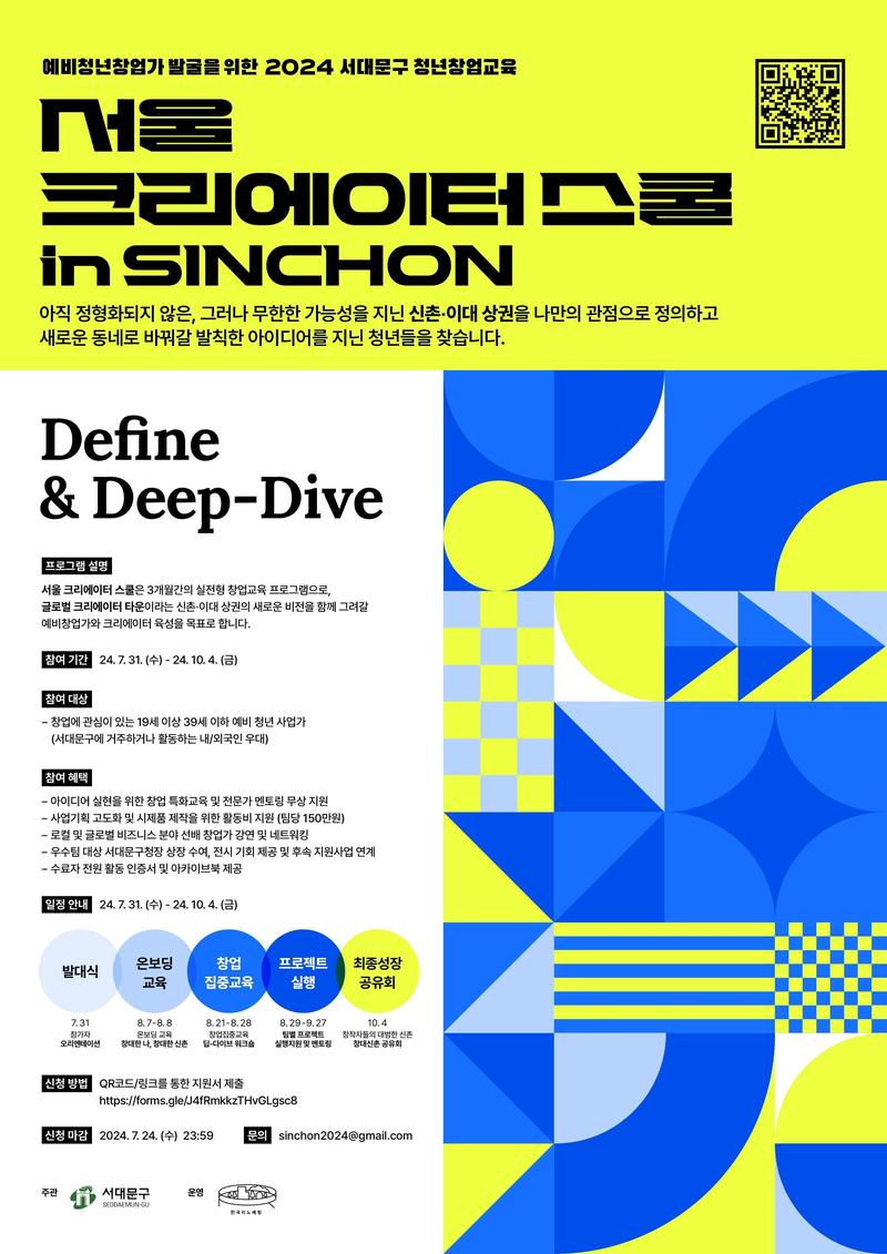 아직 정형화되지 않은, 무한한 가능성이 존재하는 신촌∙이대 상권을 새로운 동네로 바꿔 갈 발칙한 아이디어를 가진 청년들을 찾습니다.【2024 서울 크리에이터 스쿨 in SINCHON】은 3개월간의 실전형 창업교육 프로그램으로, '글로벌 크리에이터 타운'이라는 신촌 이대 상권의 새로운 비전을 함께 그려나갈 예비 창업가와 크리에이터 육성을 목표로 합니다. 서대문구 창천동과 대현동으로 구성된 신촌∙이대 상권이 다시 창대한 미래를 그릴 수 있도록, 나만의 아이디어를 마음껏 실험해보세요!많은 신청 부탁드립니다!