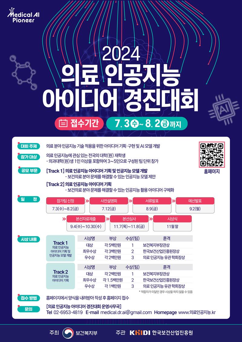 ▷ 2024 의료 인공지능 아이디어 경진대회 운영 사무국 / T. 02-6953-4816, 02-6953-4819 / E. medical.dr.ai@gmail.com