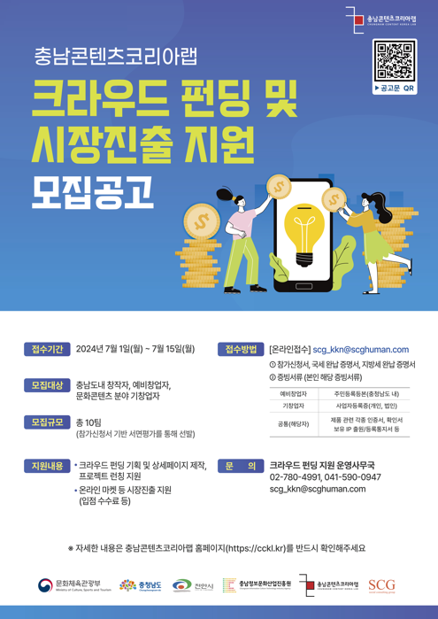2024 충남콘텐츠코리아랩 『크라우드 펀딩 및 시장진출 지원』 사업에 많은 관심과 참여 부탁드립니다.