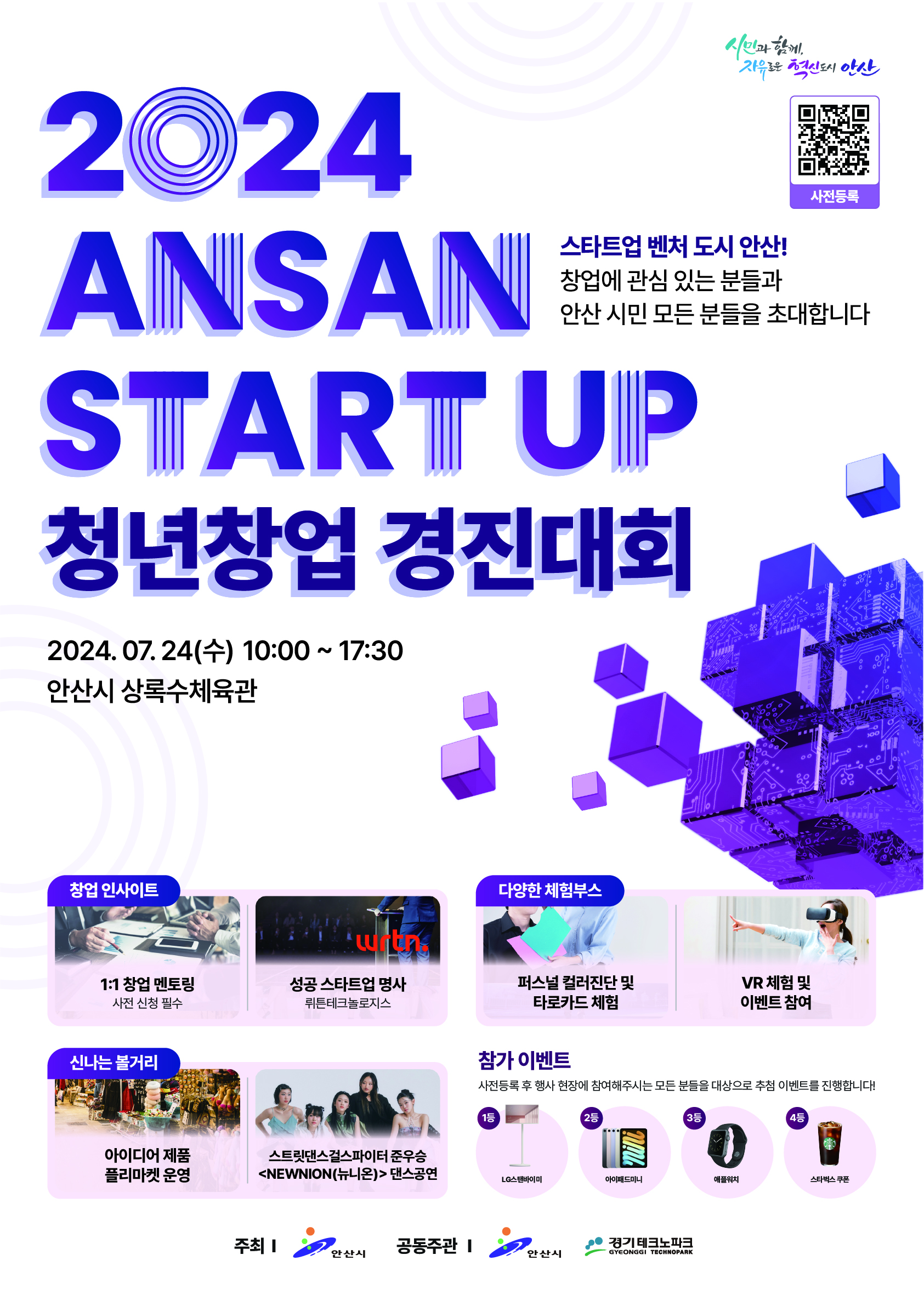 안산시는 기존의 창업 경진대회의 다소 경직된 분위기에서 벗어나 한국 사회의 다양한 구성원들에게 창업에 대한 올바른 정보를 제공하고 창업에 더욱 친숙하게 다가갈 수 있도록 친구, 가족, 연인과 함께 즐기는 안산 스타트업 청년창업 경진대회를 개최하오니, 많은 관심 부탁드립니다.