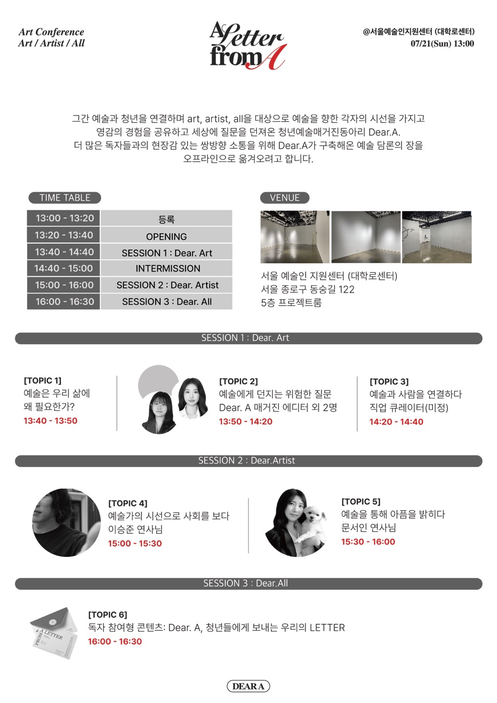 컨퍼런스는 총 3가지 세션으로 진행되며, 각각 Dear. Art, Dear. Artist, Dear. All의 주제를 담고 있습니다. 청년들의 목소리로 열린 포문은 곧바로 전문가 연사로 이어져, 독자들의 화답으로 마무리됩니다.