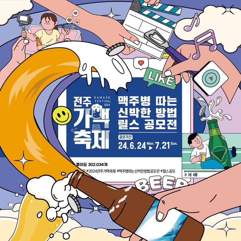 - 영상에 "2024 전주가맥축제 맥주병 따는 신박한 방법 공모전 참여합니다." 라는 멘트 또는 릴스 공모전 로고를 잘 보이게 넣어 영상을 제작해 주세요!