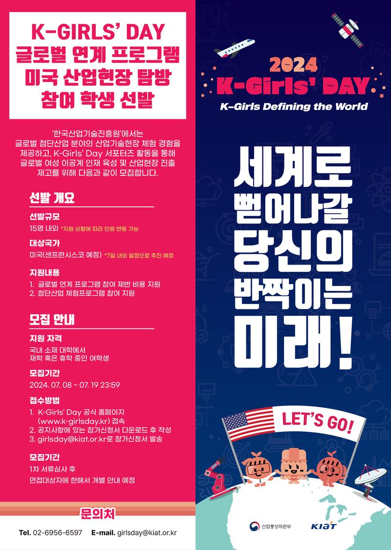올해 11주년을 맞이하는 K-Girls' Day는 이공계 대학생(여)을 대상으로 미국 글로벌 산업현장 탐방 등을 통해 글로벌 인재로 성장 및 산업현장 진출 제고를 위해 다음과 같이 학생을 모집합니다.