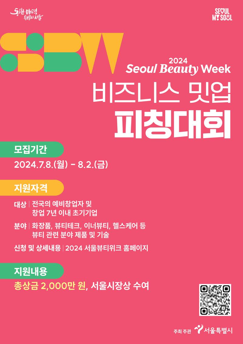 2024 서울뷰티위크의 ‘비즈니스 밋업 피칭대회’ 참가를 원하는 뷰티관련 분야의 기업을 다음과 같이 공개 모집합니다.