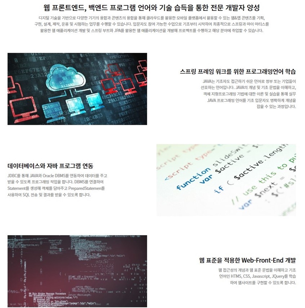 - 웹 프론트엔드, 백엔드 프로그램 언어와 기술 습득을 통한 전문 개발자 양성