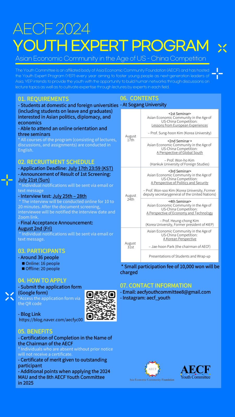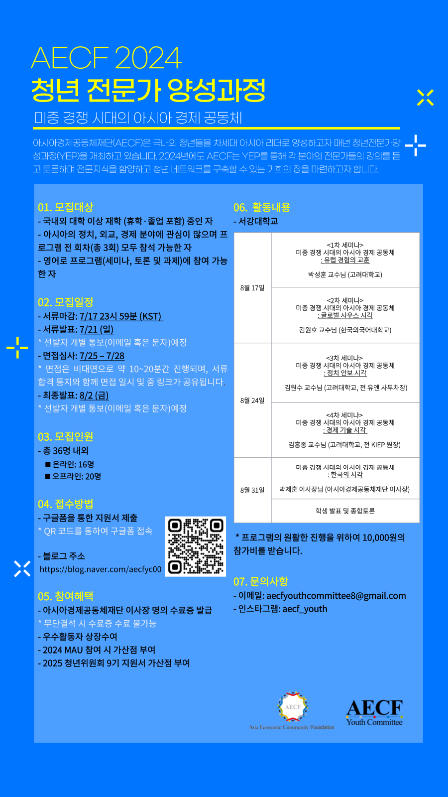 - 아시아경제공동체재단(AECF)은 국내외 청년들을 차세대 아시아 리더로 양성하고자 매년 청년전문가양성과정(YEP)을 개최하고 있습니다. 2024년에도 AECF는 YEP를 통해 각 분야의 전문가들의 강의를 듣고 토론하며 전문지식을 함양하고 청년 네트워크를 구축할 수 있는 기회의 장을 마련하고자 합니다.
