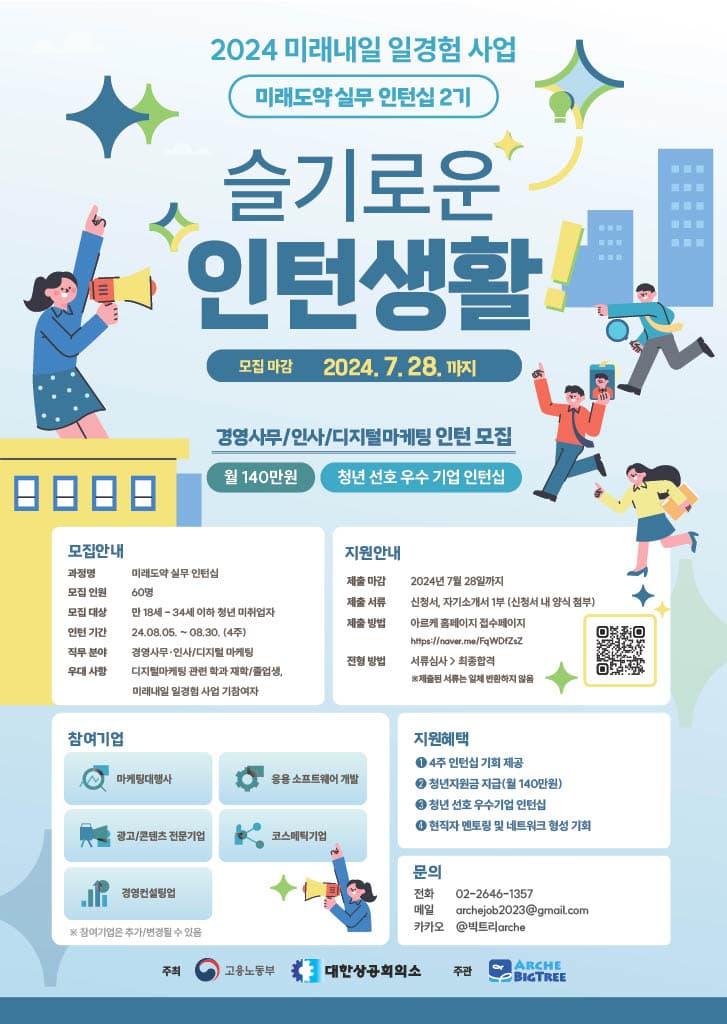 고용노동부 대한상공회의소 주최로 실시하는 “2024 미래내일 일경험 사업 미래도약 실무 인턴십 2기” 참여자를 모집합니다. 인턴십 4주 과정 모집중 !!
