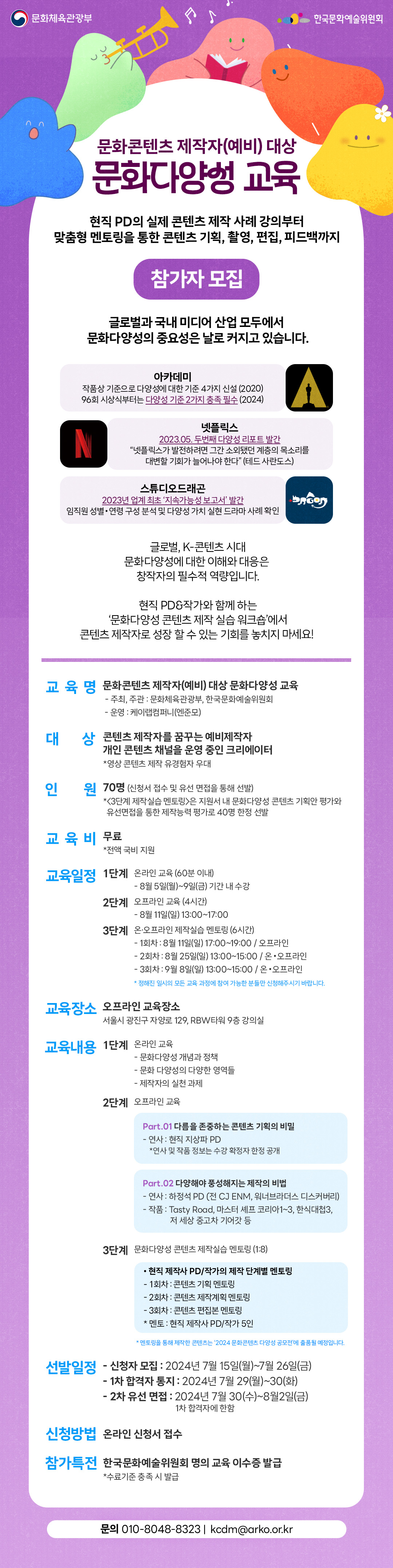 콘텐츠 제작자를 꿈꾸는 예비 제작자라면 누구나 신청 가능합니다. 단, 3단계 교육은 10분 이내의 영상 콘텐츠를 제작해야 하기 때문에 기존에 영상 콘텐츠 제작 경험이 있거나 촬영/편집 툴을 다룰 수 있는 분들을 우대합니다.