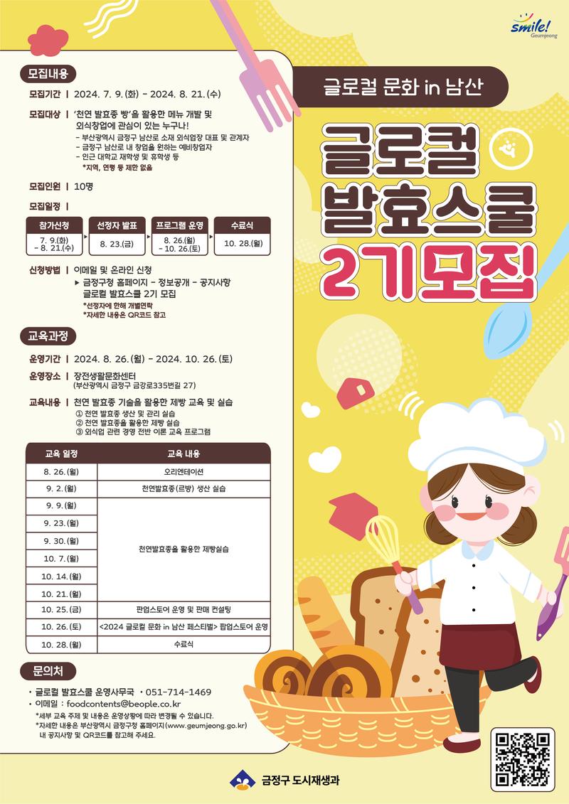 이메일 및 온라인 신청 : 금정구청 홈페이지(https://url.kr/u2gbq4) - 정보공개 - 공지사항 - 글로컬 발효스쿨 2기 모집