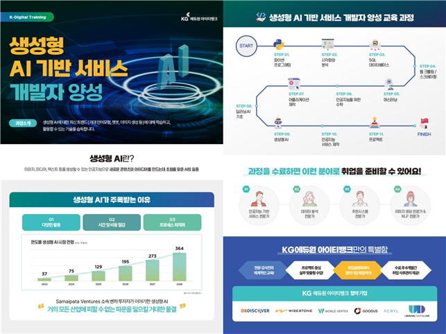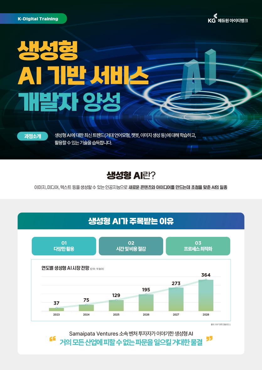 생성형 AI에 대한 최신 트렌드(거대 언어모형, 챗봇, 이미지 생성 등)에 대해 학습하고 활용할 수 있는 기술을 습득할 수 있는 국비지원 교육 과정이랍니다.