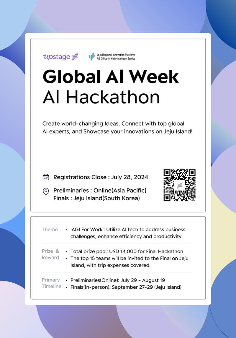 The top 15 teams will be invited to the Global AI Week-final Hackathon on Jeju Island, with support for trip expenses covered.