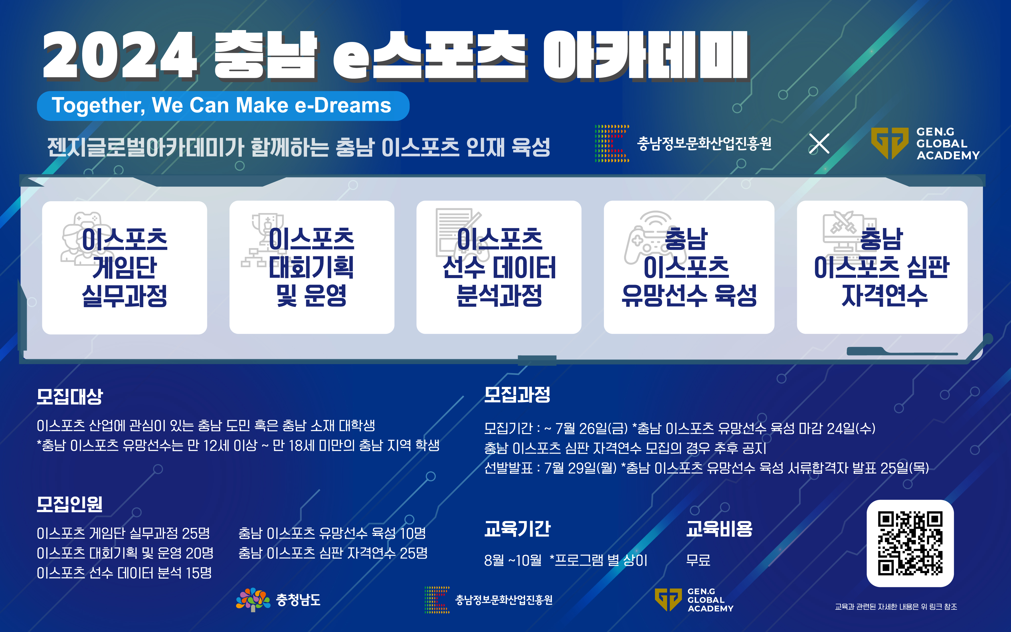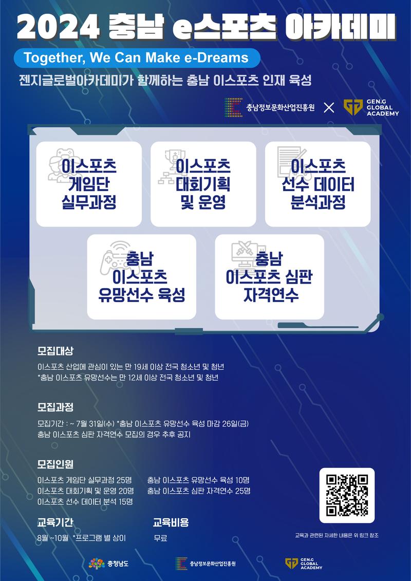 충남정보문화산업진흥원과 젠지글로벌아카데미가 함께하는 "2024 충남 e스포츠 아카데미"충남지역의 e스포츠 문화 발전 및 전파를 위해 다양한 e스포츠 교육을 진행합니다.