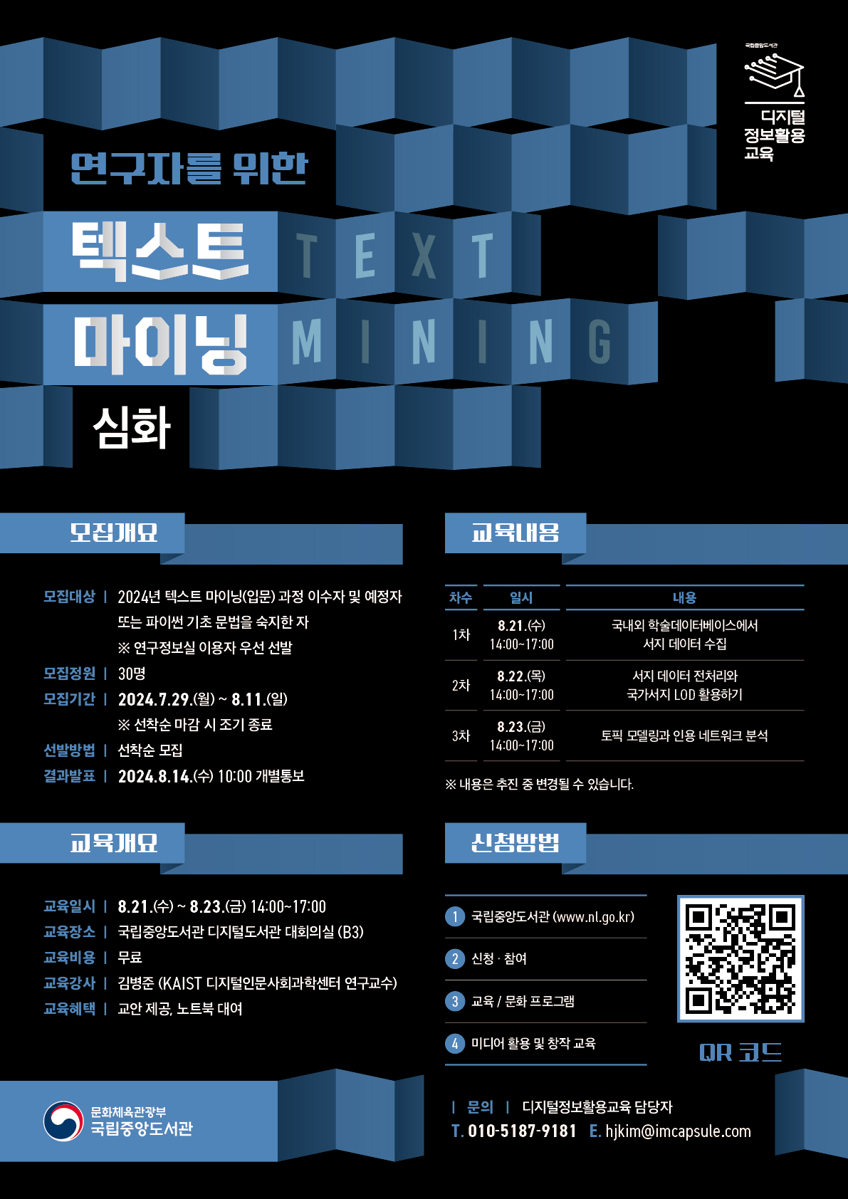 국립중앙도서관 연구정보실은 '연구자를 위한 텍스트 마이닝(심화)' 교육을 운영합니다.