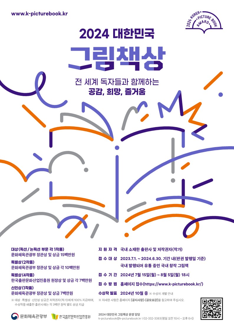 - 보내실 곳: (04011) 서울시 마포구 망원로 96, 연세빌딩 6층 ‘2024 대한민국 그림책상 운영 담당’ (☎ 02-332-3383)