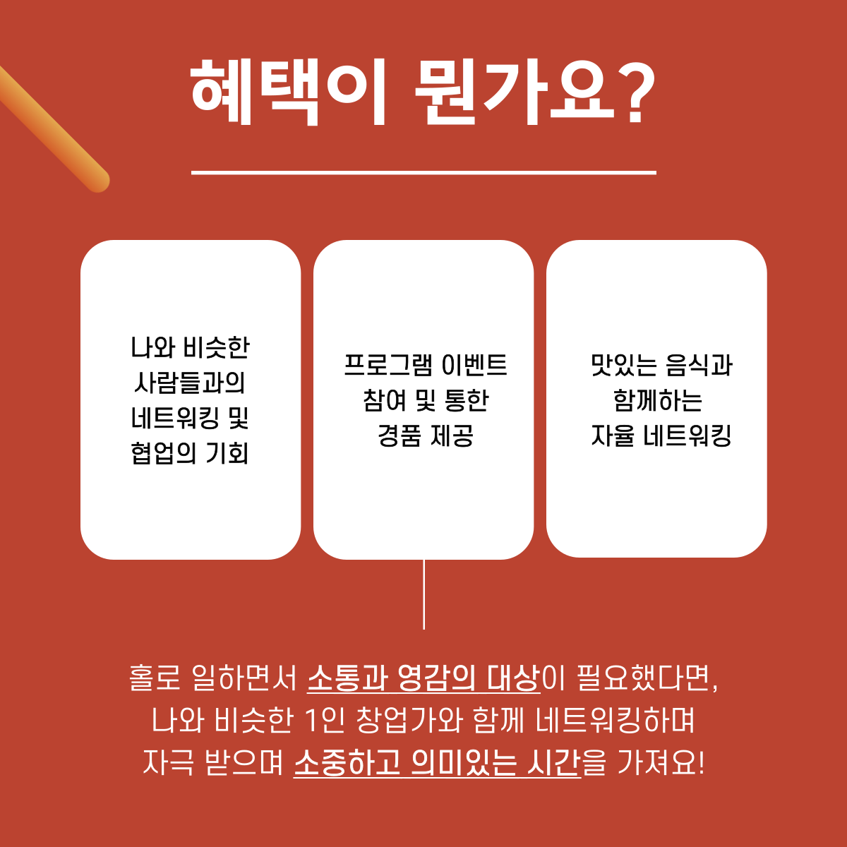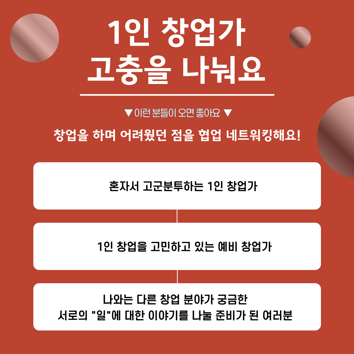 그동안 홀로 일하면서 소통과 영감의 대상이 필요하진 않으셨나요? 오늘 하루 동안 혼자가 아닌, 나와 비슷한 1인 창업가와 함께 네트워킹하며 자극받고 영감을 불어 넣는 시간을 가져요!