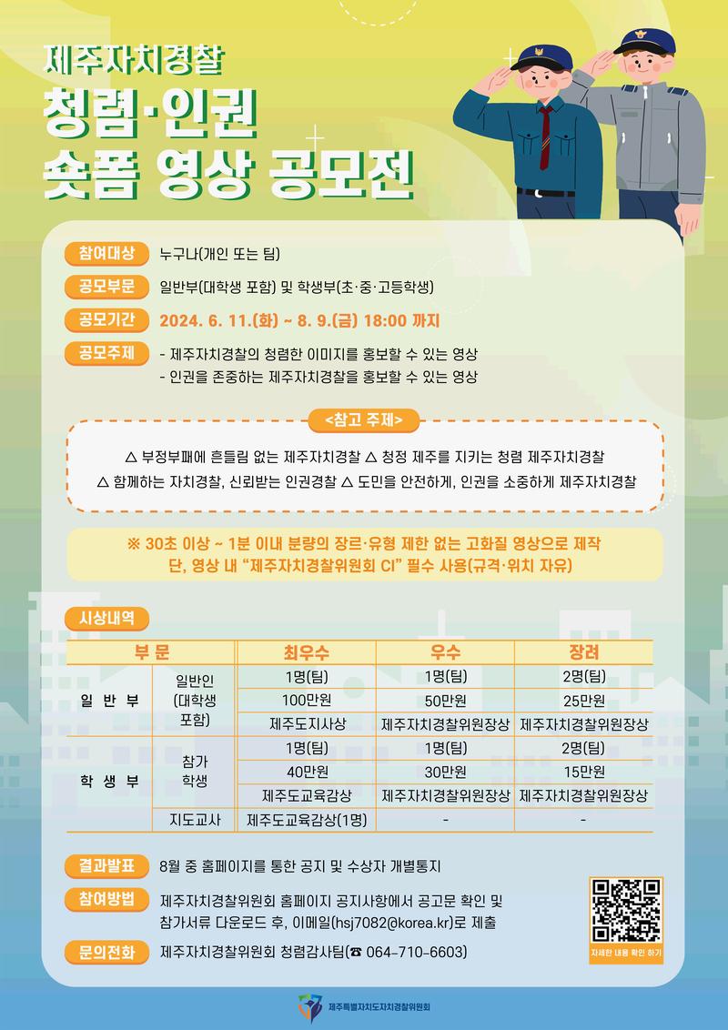 ▸(분량) 숏폼 영상(30초 ~ 1분 이내) ▸(파일) mp4(권장), mpeg4, wmv, avi, mov ▸(화질) 1920 × 1080 픽셀 이상 고화질 원본 ▸(유형) 애니메이션, 브이로그, 뮤직비디오 등 영상 유형 제한 없음 ▸(참고) 영상 내 “제주자치경찰위원회 CI” 필수 사용(크기·위치 자유, 공고문 하단 참고) | ||
