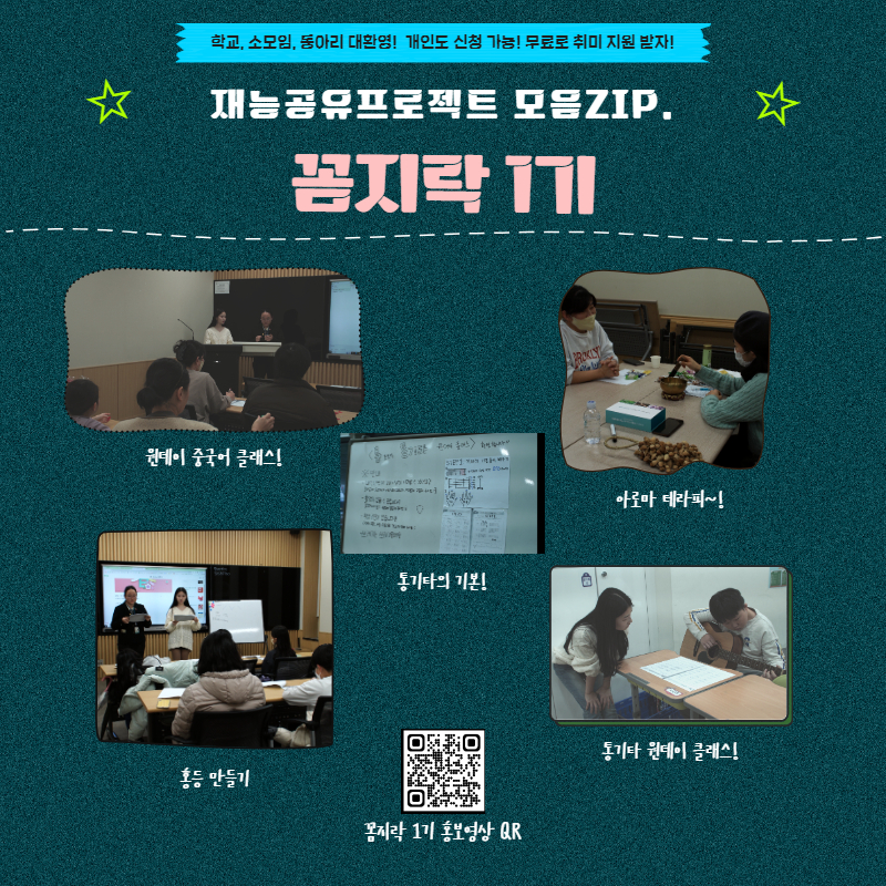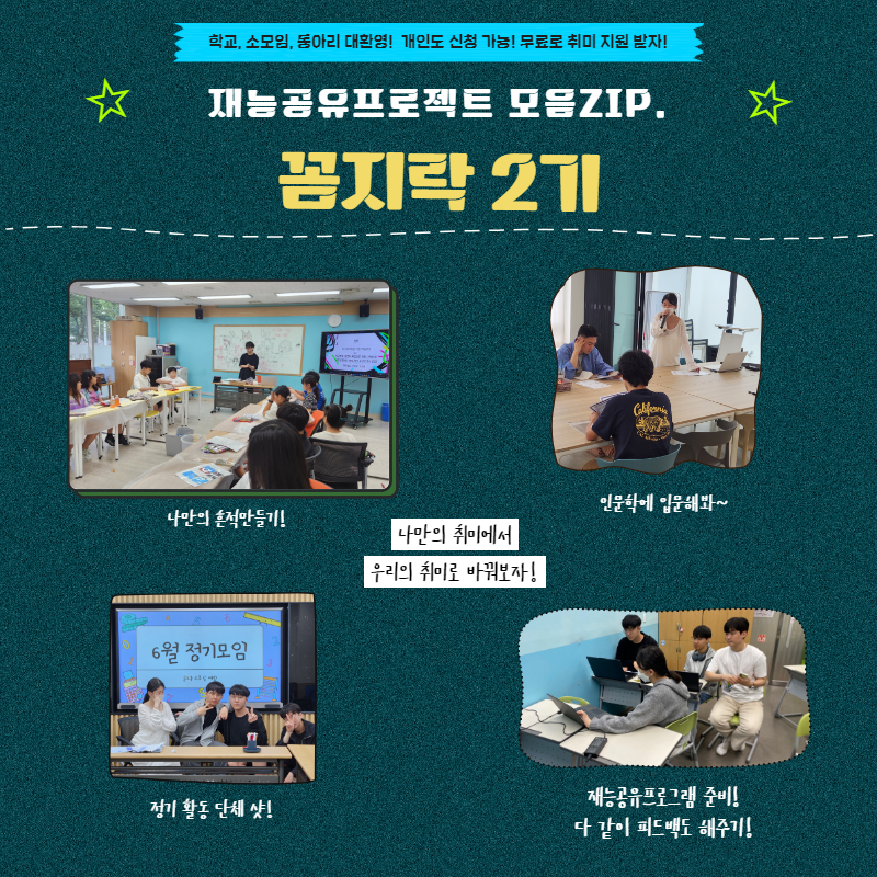 [꼼지락]이란 여러분들이 즐기는 취미 및 재능을 무료로 지원받고 내가 잘하고 좋아하는 취미활동을 알려주고 공유하는 (활동 기획-> 진행까지)하는 프로젝트입니다✨