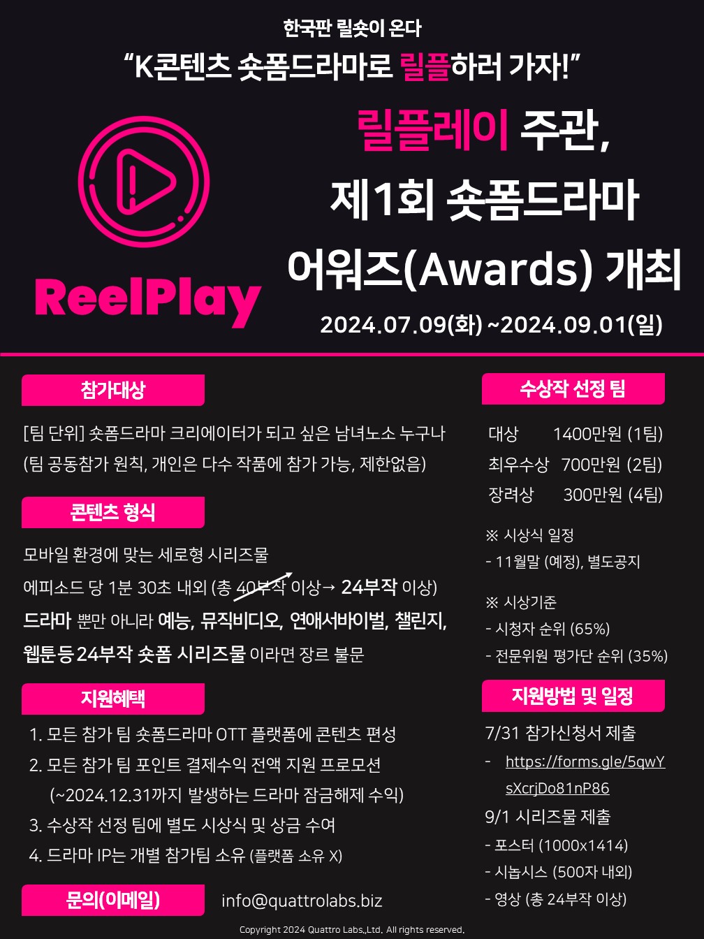 금번 저희가 "제1회 K콘텐츠 숏폼드라마 어워즈(Awards)"를 개최하오니 많은 관심과 참여 부탁드립니다